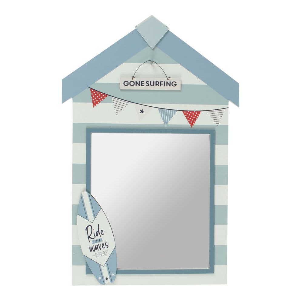 This whimsical wall mirror is shaped like a beach hut and is finished off with a cute surf board and 'gone surfing' accent. Perfect for any seaside abode. Edit Product Dimensions: H48cm x W30cm x D9cm Packaged Dimensions: H49cm x W31cm x D10cm